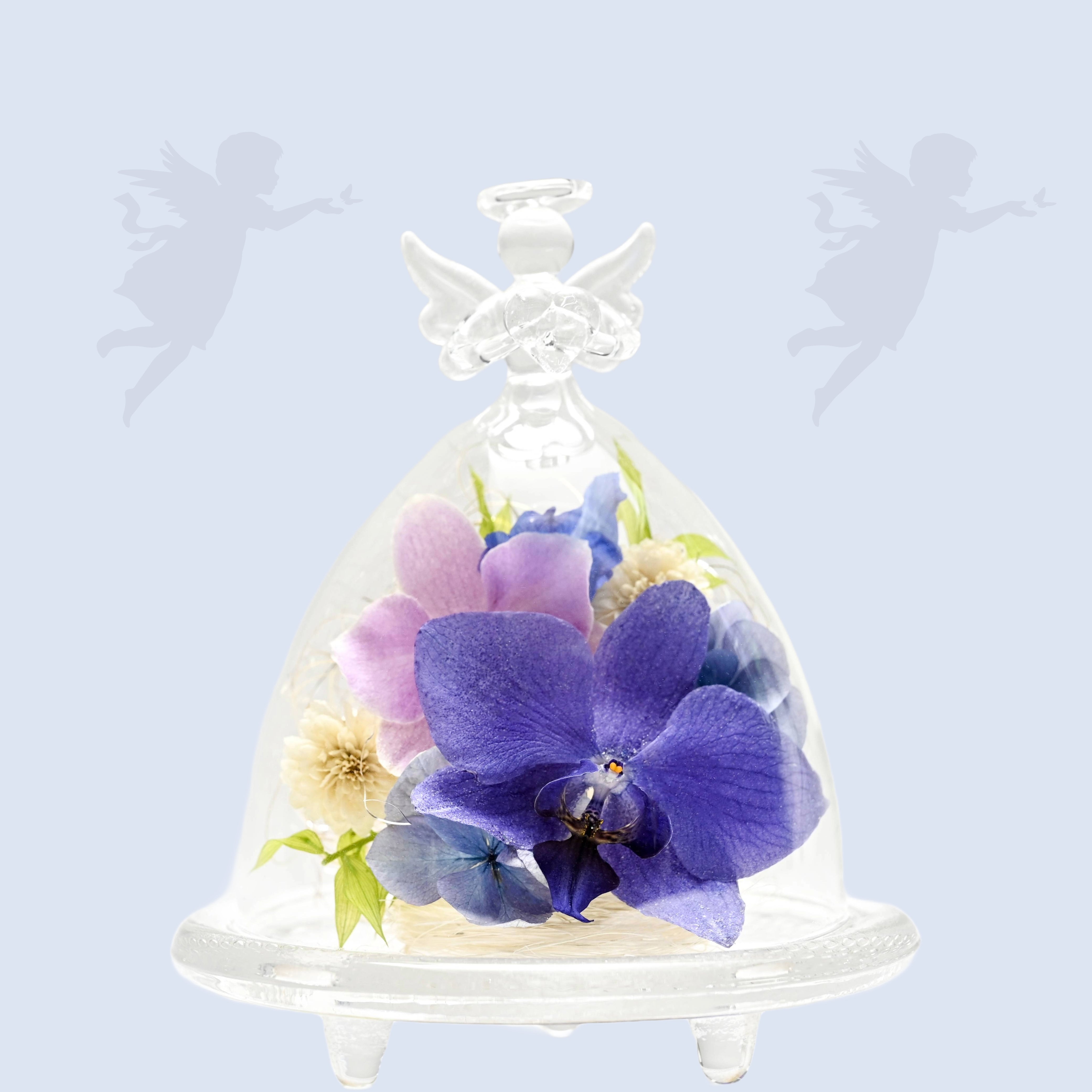 手のひらサイズながら、天然青の美しさと天使モチーフが際立ちます。飾る場所を選ばず、見るたびに想いが伝わる、上品で特別なフラワーギフトです。